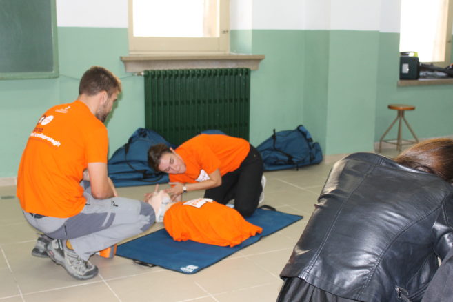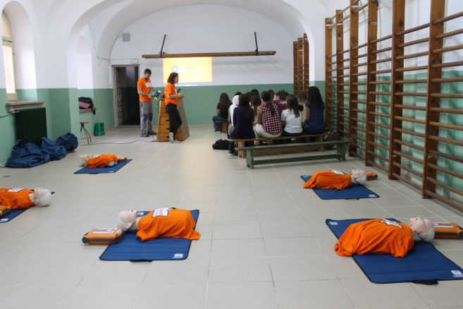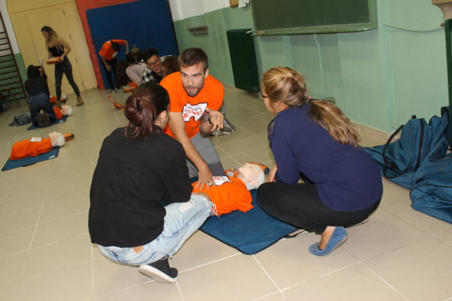 A partir de petits grups d’alumnes van realitzar les maniobres de compressió toràcica als maniquís i van continuar el procés de reanimació utilitzant els desfribil·ladors.