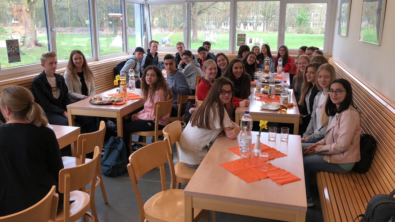 On Friday morning, each one had a lesson, only for an hour. Then, only the Catalan students met in the institute’s forum to go to Düsseldorf by train. When we arrived in Düsseldorf we took a tram that took us to the center of the city. When we arrived we were shown important buildings. Then we went up to Rheinturm, which is a very tall building from where you can see the whole city. The views were very nice since we could see the city at our feet. There on top of the tower some of us ate a Pretzel which is a typical food from there. Later, we got off the tower and we walked around the city, they showed us the city hall, parliament and others buildings. Then, we had free time to go around the city. We bought souvenirs and some ate a Wurst. Then we walked a bit more and finally we left on a train to Grevenbroich. Then, we all went with our corresponding Germans and everyone spent the afternoon in a different way with the family. Around six in the afternoon we all met at the high school, where each family brought something to eat. We ate and talked all together. The German professors thanked us and they said goodbye to us. Later, some went home and others went for an ice cream in the city. Finally, we went home and that’s how the day was over.