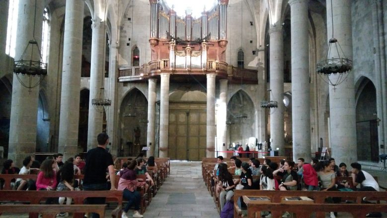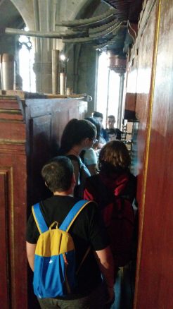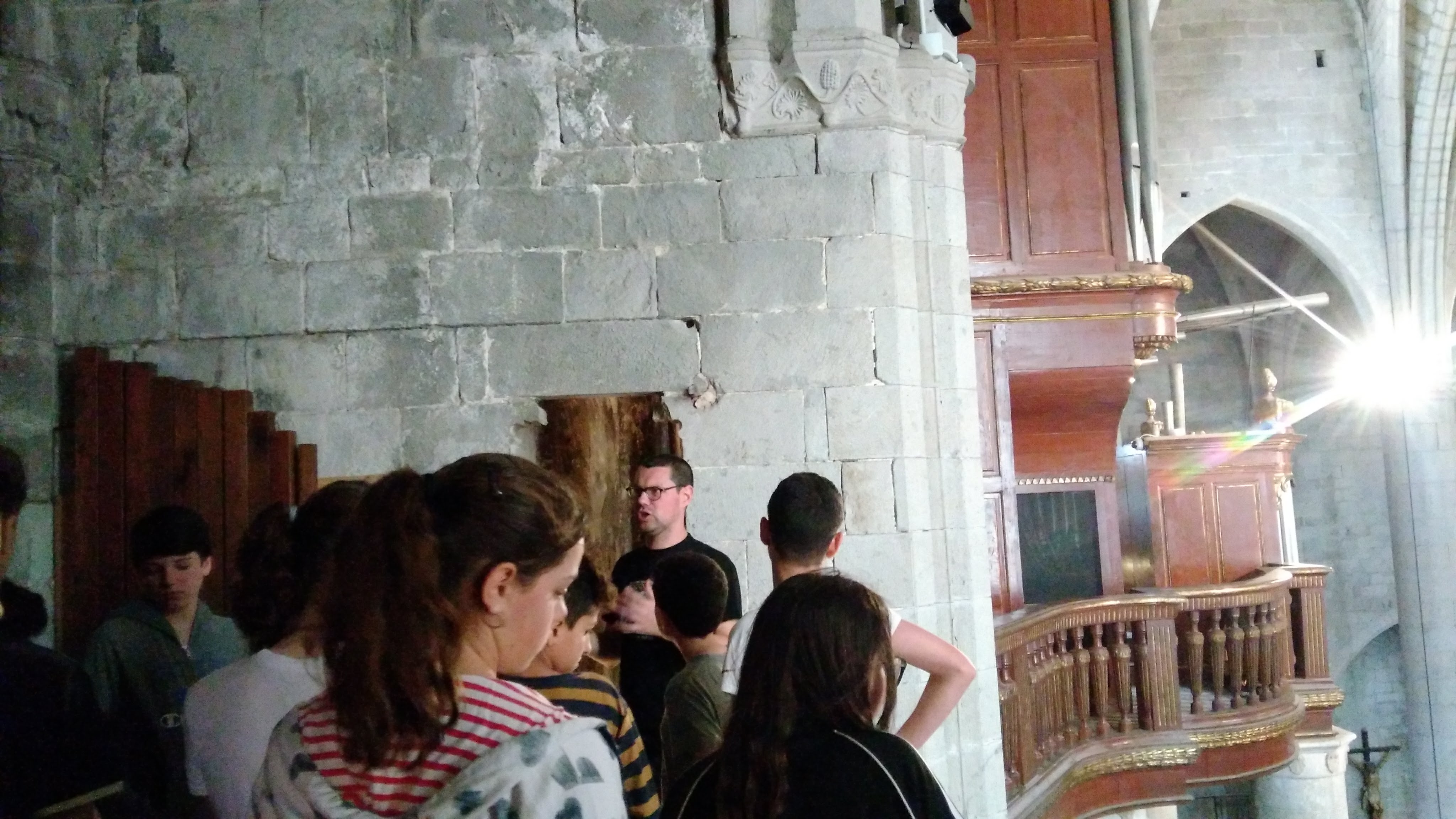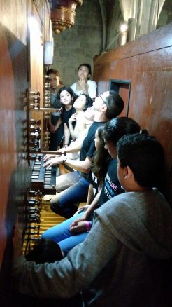 L’Orgue ens va ser presentat per l’organista titular de la Basílica, el senyor Pau Riuró, que va començar explicant la història de l’instrument, acabat de restaurar fa un any i mig. Després el va tocar mentre l’alumnat escoltava des de la nau central la magnífica acústica dels seus quasi 5000 tubs. I per últim, va permetre que pugessin a dalt, en grupets de 12 alumnes, per mostrar-los la consola amb els 4 teclats, pedaler, registres, manxes, mentre anava tocant davant d’ells. Tots van quedar meravellats d’aquest tresor musical de Castelló.