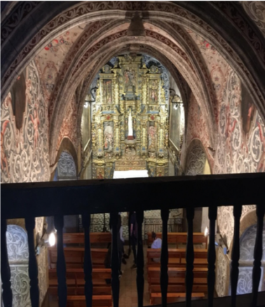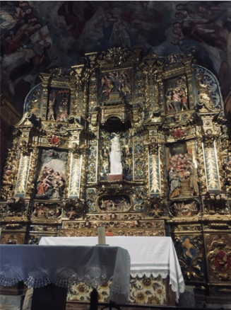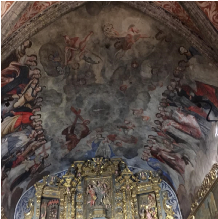 Seguidament, també se’ns presenta la capella, la qual juga un paper molt important a la novel·la. Segons la Mila, era un lloc fosc, repulsiu i lleig, amb un altar que incorporava en sí un reraltar, i es basava en l’adoració a un Sant. Aquesta va resultar ser una mica decepcionant en alguns aspectes importants que no vam poder comparar amb la obra, com ho era el reraltar, on succeïx el clímax de la novel·la, el qual en la ermita de Santa Caterina era inexistent. A més a més, era molt acolorida i no transmetia sensació de malestar, tal i com la protagonista ho veu. Ara bé, petits detalls referits a la decoració del retaule de l’altar, o les ofrendes al sant, i les pinures del sostre, si que coincidiren a la perfecció amb la descripció que se’ns hi donava. També, tenia diferents finestroles, des de les quals veía aparèixer a la gent, com per exemple en els primerscapítols amb la aparició de l’Ànima. També vam poder veure el compartiment de la Sagristia, on hi vam poder entrar a fer una ullada, tot i que en l’obra només hi fa una petita referència.