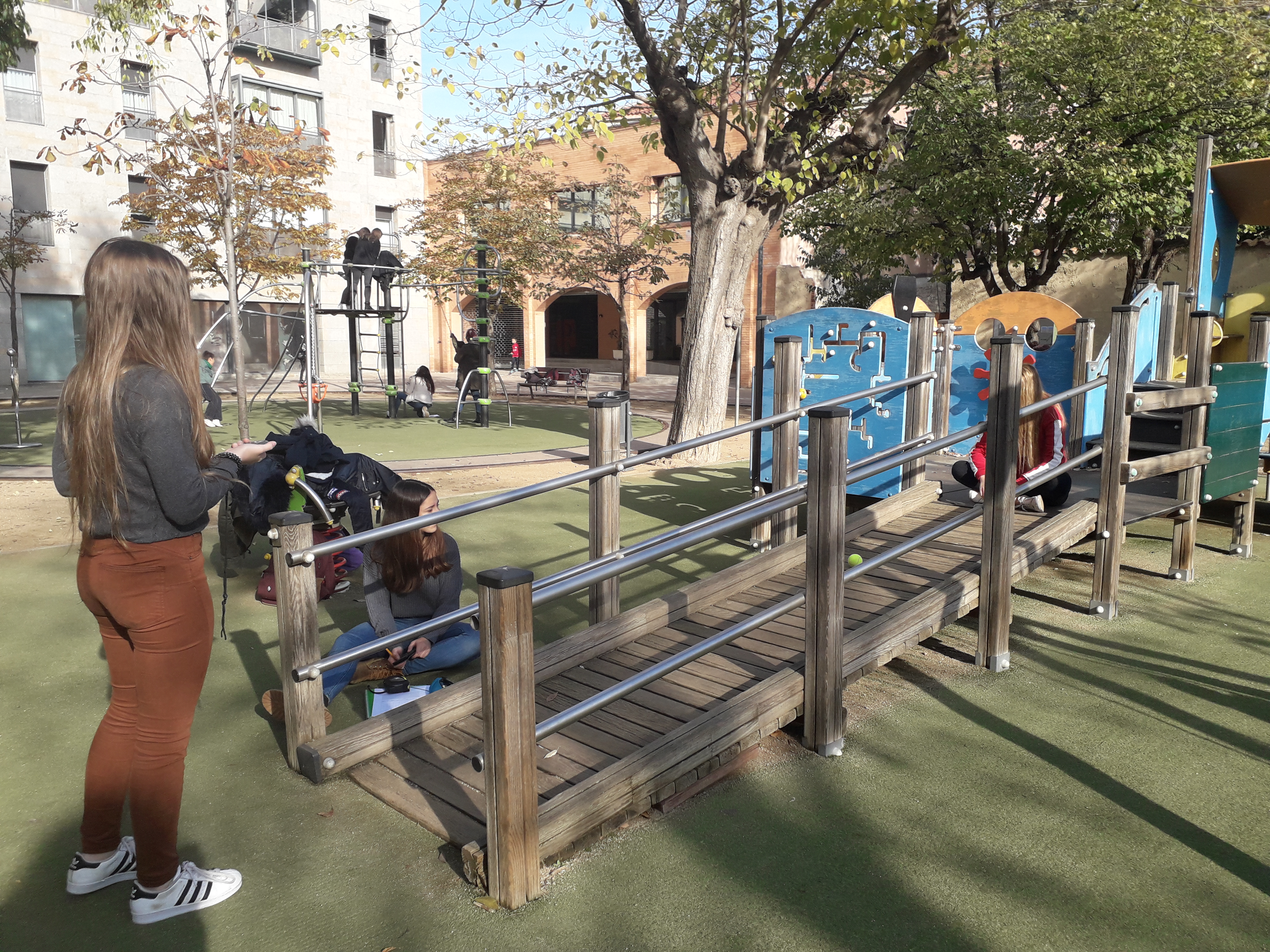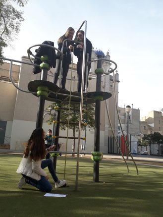 Avui dijous 29 de novembre hem fet unes pràctiques de física amb les alumnes de 1r de batxillerat que no han secundat la vaga d’estudiants. Han fet diverses mesures de cinemàtica aprofitant les instal·lacions del parc infantil annex al teatre El Jardí.
