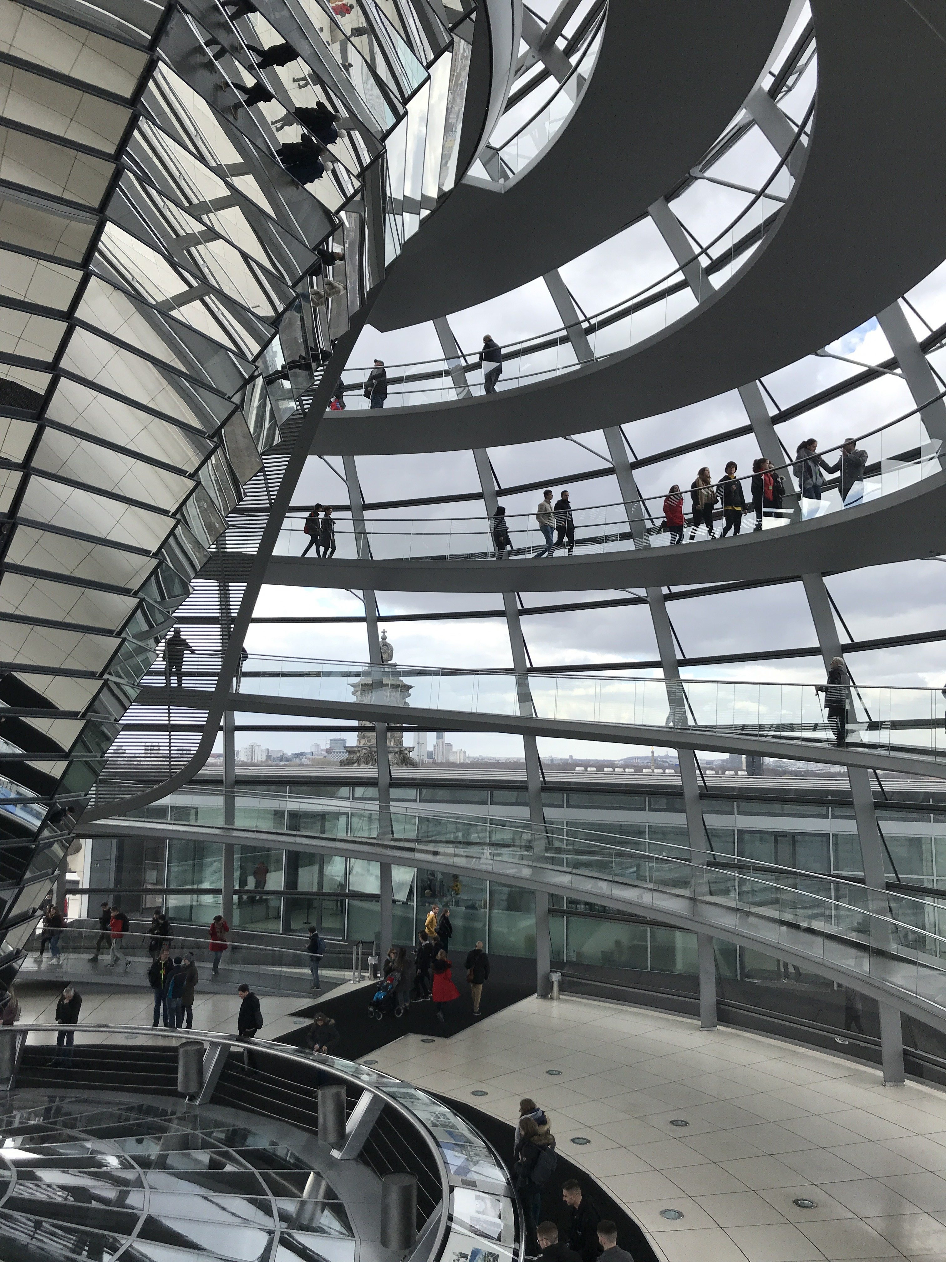 Dimarts i dimecres han sigut intensos. Ahir dimarts, vam començar per Alexander Platz, als peus de la Torre de Televisió, per fer un tour per la ciutat que ens va portar, entre d’altres, per l’Unter den Linden i els edificis colindants, al Checkpoint Charlie, el Memorial als Jueus, la Porta de Brandemburg i el Bundestag, amb la meravellosa cúpula de Norman Foster. A la tarda vam estar al Menorial de Mur i vam fer unes compres al Mall de Berlín.