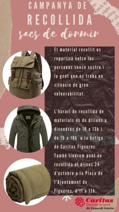 L’acció acabarà el 24 d’octubre a les 12:00 amb una concentració organitzada per Càritas la plaça de l’Ajuntament de Figueres, on es llegirà un manifest. Aquest dia es farà també una recollida de sacs i jaquetes d’hivern (nous o de segona mà).