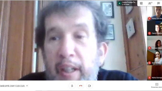 Teníem previst que l’autor ens visités a finals de mes a l’institut i, davant la impossibilitat de dur a terme aquesta activitat, en Joan-Lluís Lluís es va avenir molt amablement a fer una vídeotrobada amb nosaltres, ahir divendres 8 de maig. Vam estar més d’una hora parlant amb ell de la novel·la: dels personatges, del passat històric, de les ucronies… i també de la llengua i la cultura catalana, i de la seva situació actual a la Catalunya Nord.