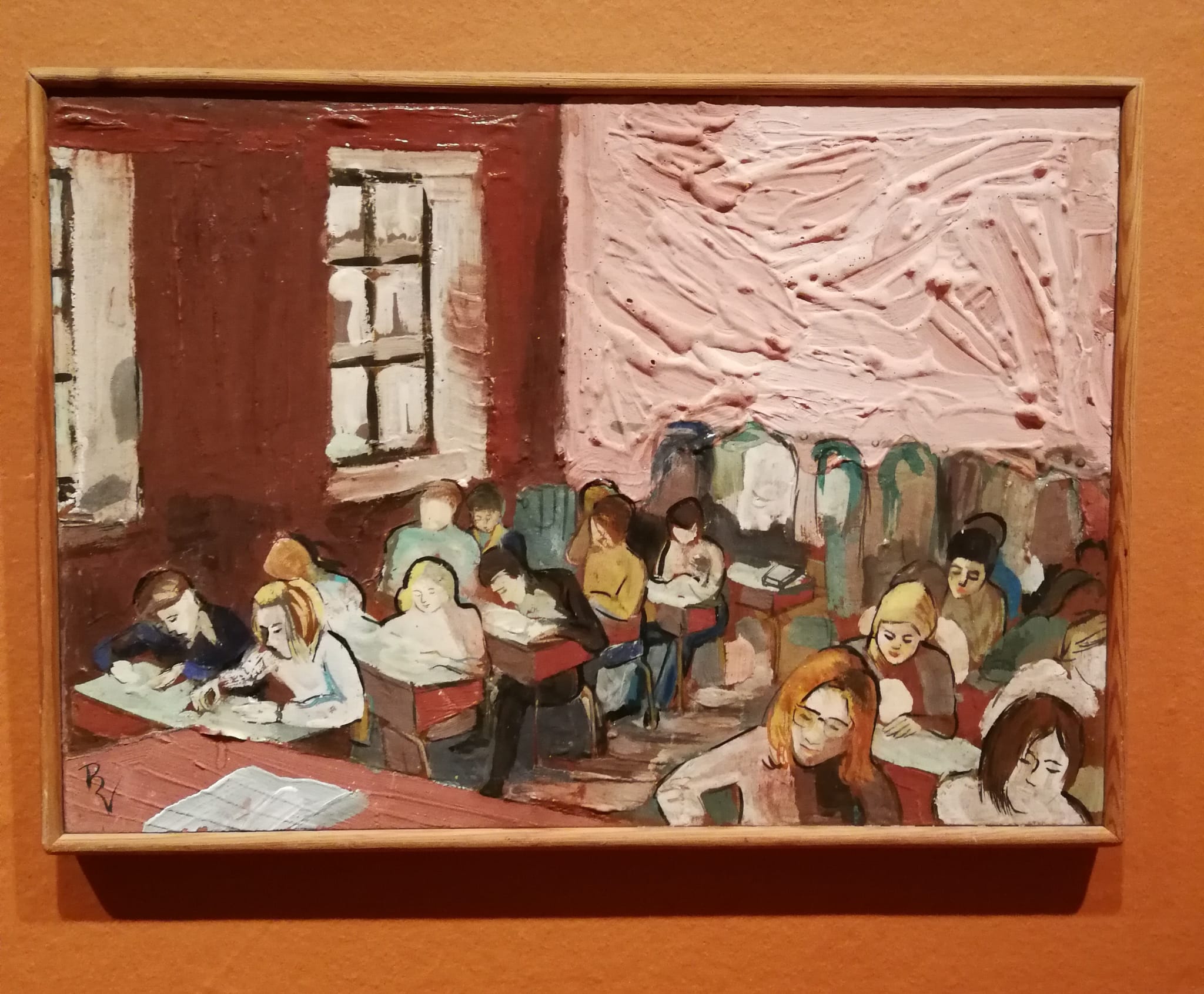 En el marc de la magnífica exposició “Pintar, crear, viure. Dones artistes a l’Alt Empordà (1830-1969)”, que s’ha inaugurat recentment al Museu de l’Empordà, destaca un quadre de 1970 on la pintora Dora Riera retrata uns alumnes de l’institut Ramon Muntaner a classe, potser a l’aula 3. Han passat 50 anys i les escenes d’avui no són tan diferents… Això sí, ara, amb mascareta.