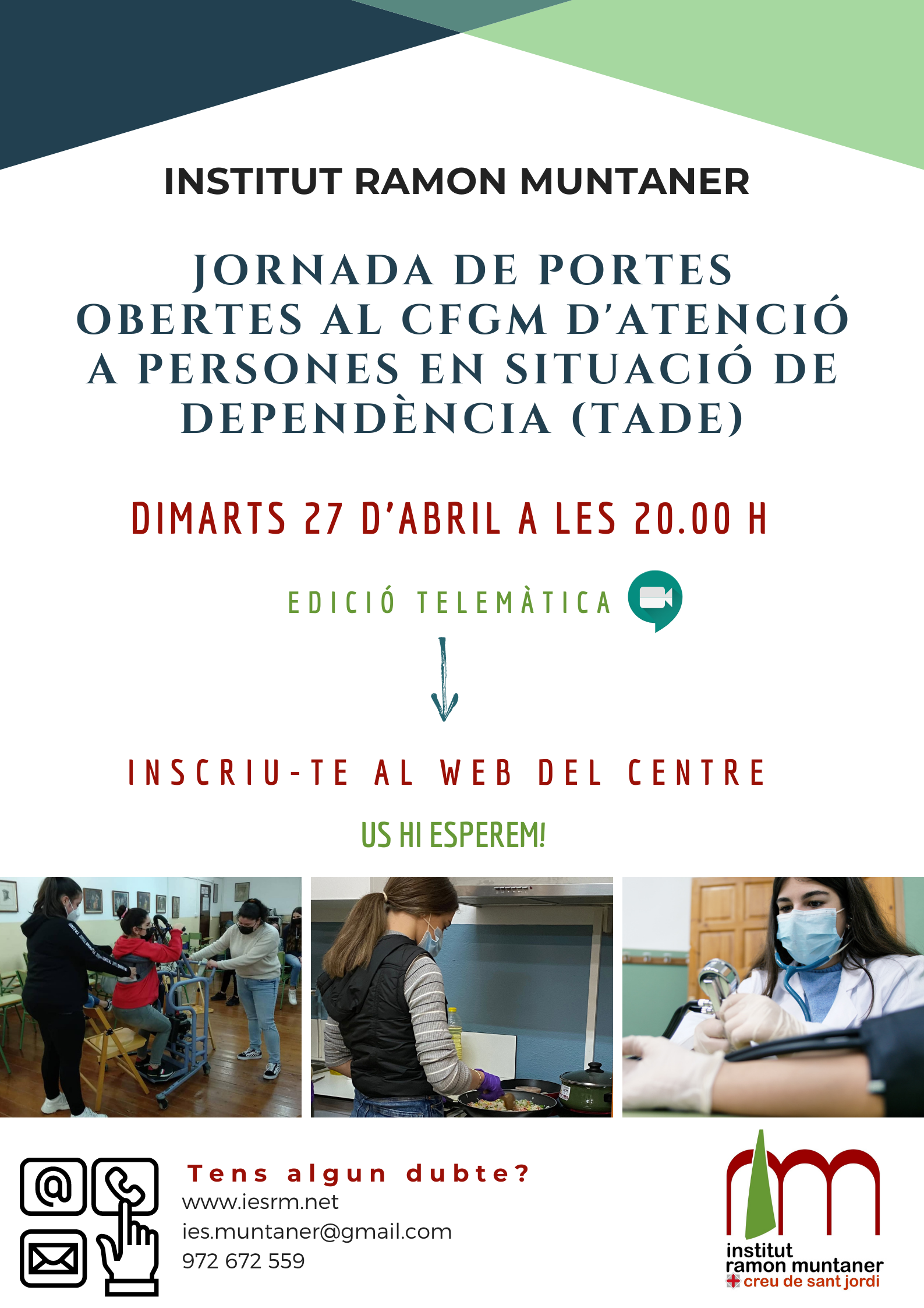 El dimarts 27 d’abril a les 20.00 h realitzarem una sessió telemàtica de Jornada de Portes Obertes del CFGM d’atenció a persones en situació de dependència.