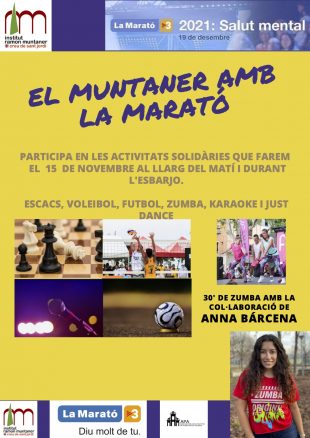 Dilluns 15 de novembre hem organitzat un seguit d’activitats que serviran per col·laborar amb la Marató de TV3, que aquest any està dedicada a la salut mental. Les activitats que es proposen per als alumnes d’ESO són lúdiques i esportives. L’alumnat, professorat i personal del celntre hi col·labora amb un donatiu solidari que es destinarà íntegrament a la Marató.
