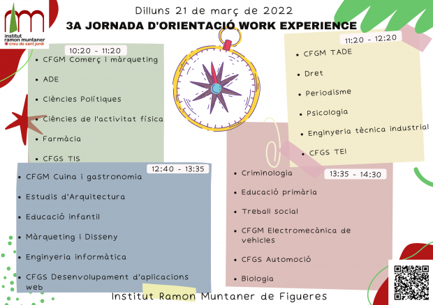 Dilluns 21 de març celebrem la 3a edició de la jornada d’orientació professional Work Experience. En aquesta jornada hi participa l’alumnat de 4t d’ESO, Batxillerat i CF.