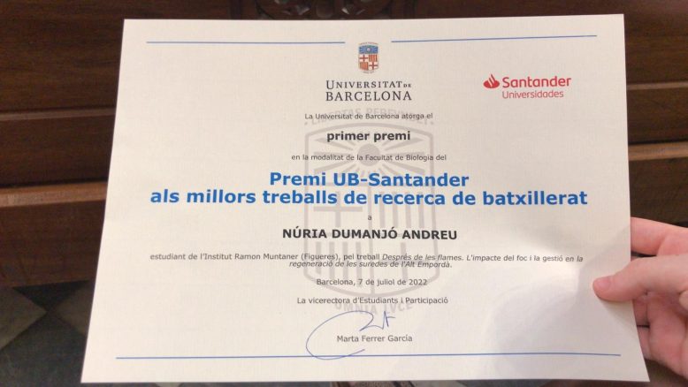 La Núria Dumanjó va ser guardonada amb el primer premi pel seu TdR «Després de les flames. L’impacte del foc i la gestió en la regeneració de les suredes de l’Alt Empordà»