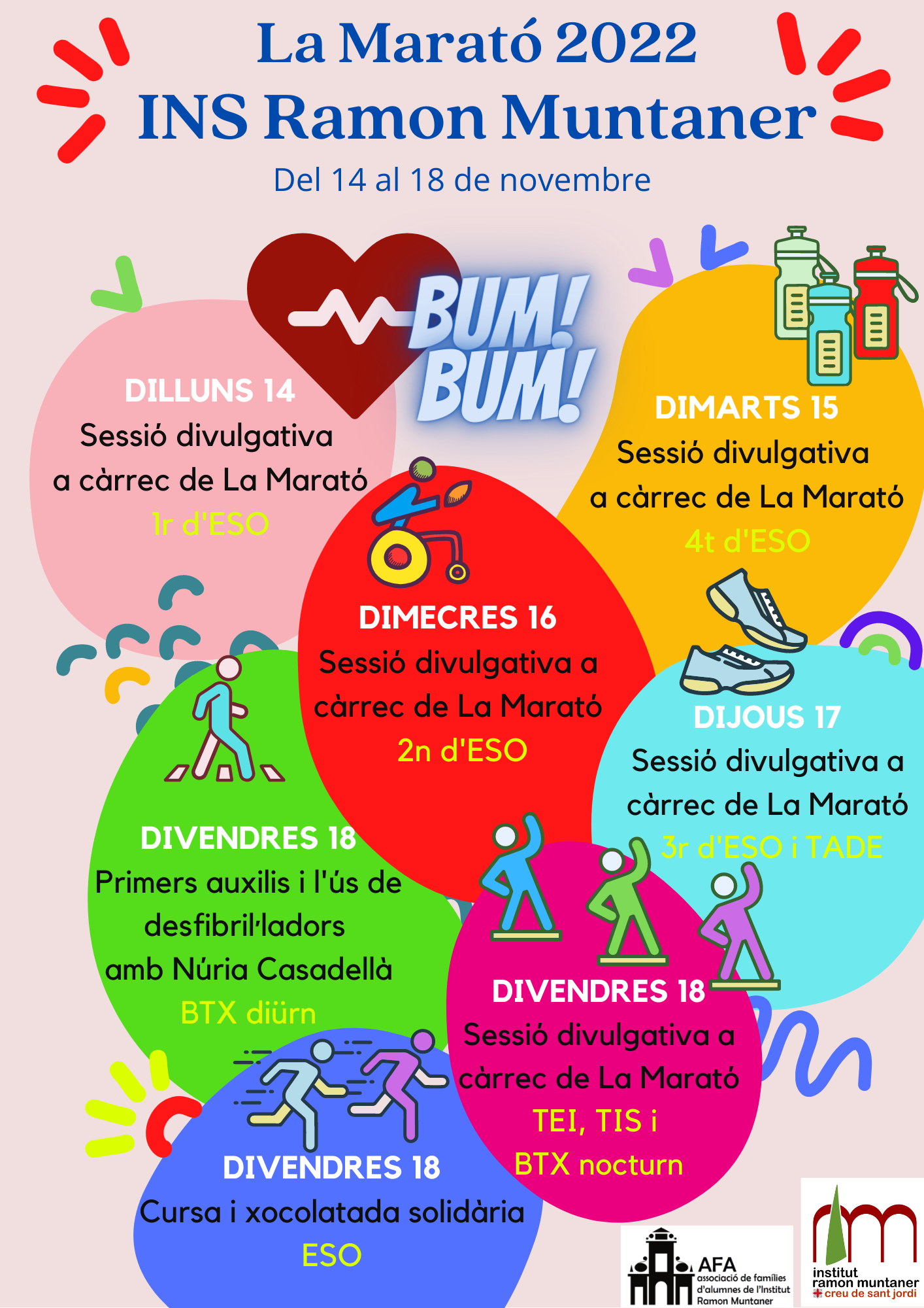 Avui hem començat els actes de La Marató 2022, que enguany està dedicada a les malalties cardiovasculars. Al llarg d’aquesta setmana tots els grups d’ESO, batxillerat nocturn i cicles formatius rebran la visita de persones vinculades a la Fundació de La Marató que els parlaran de la importància de gaudir d’una bona salut cardiovascular. A més, la Núria Casadellà farà un taller molt interessant i necessari a batxillerat diürn sobre primers auxilis i l’ús del desfibril·lador.
