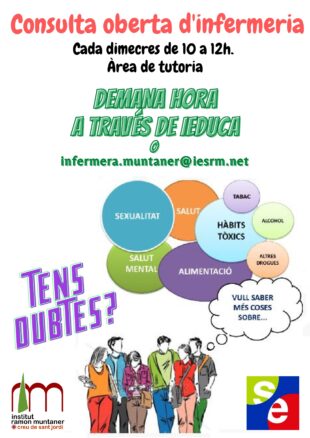 Atenció, canvi de dia de les sessions de consulta oberta d’infermeria al centre. A partir de la setmana del 20 de febrer, la infermera us rebrà els dimecres (no els dilluns) de 10 a 12h a l’àrea de tutoria per tal de parlar amb vosaltres, de forma totalment confidencial, dels aspectes de salut que us puguin preocupar. Cal demanar cita prèvia a través del següent formulari (que també trobareu penjat a iEduca) o escriure un correu a infermera.muntaner@insrm.cat