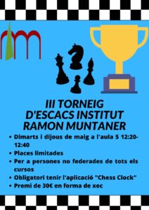 Esteu convidats a participar en el III Torneig d‘Escacs, que se celebrarà al nostre institut durant el mes de maig, al segon pati dels dimarts i els dijous, a l’aula 5. El premi consistirà en una copa pels 1r, 2n i 3r guanyadors del torneig i, a més pel primer lloc es donarà un xec de 30 € per gastar en qualsevol establiment de l’associació de comerç de Figueres. Cal omplir el formulari d‘inscripció, l’enllaç del qual trobareu seguidament. Animeu-vos!!