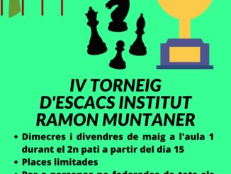 Apunta’t al IV Torneig d’escacs del Muntaner! El torneig d’enguany tindrà lloc els dies 15, 17, 22, 24, 29 i 31 de maig (dimecres i divendres a patir del 15 de maig) al segon pati a […]