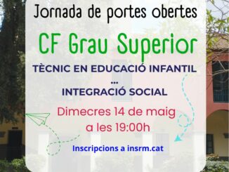 El proper dimecres 14 de maig a les 19h tindrà lloc la jornada de portes obertes dels CF de grau superior d’educació infantil i integració social. Inscriviu-vos a la jornada aquí.