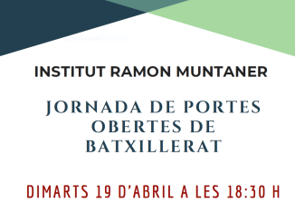 La jornada de Portes obertes de Batxillerat tindrà lloc el dimarts 19 d’abril a les 18:30h en format presencial al centre. Cliqueu damunt la imatge per accedir al formulari d’inscripció. Us hi esperem!