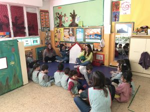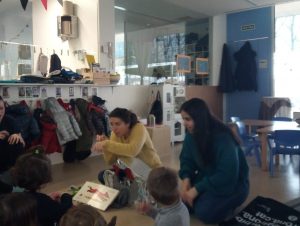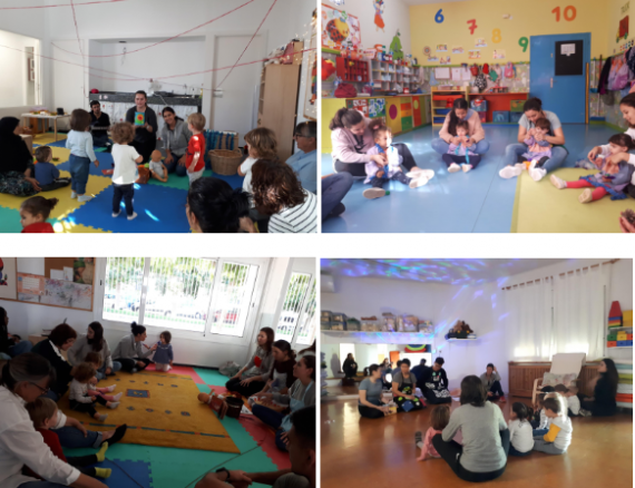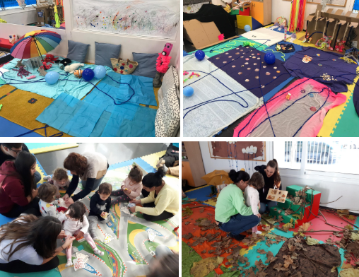És diferencial el paper del contacontes: es posa davant dels i les participants de la sessió amb un nino i les famílies van imitant els mateixos moviments que fa però en comptes de fer-ho amb un nino els fan als seus infants. Aquests moviments consisteixen en passar diferents materials per sobre de l’infant, perquè experimenti cada un dels materials/objectes i el puguin relacionar amb els personatges que apareixen en el conte que s’està explicant. Totes les accions i els personatges de les històries que s’expliquen en aquestes sessions, agafen personalitat tàctil i les nostres mans recorren el cos de l’infant convidant-lo un marc de sensacions (Ex: representem les formigues amb la punta dels dits) plenes d’afectivitat i amor.